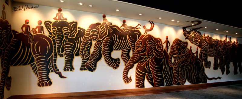 「犀ではなく象が描けないか」と言いながら、豊君は壁面に私を案内した。一階レストランの壁だった。店名通り、オリエンタル調だった。私は壁を見た瞬間、イメージが固まった。アジアの象と象使いたちが10mの大壁面を駈けぬけてゆく。