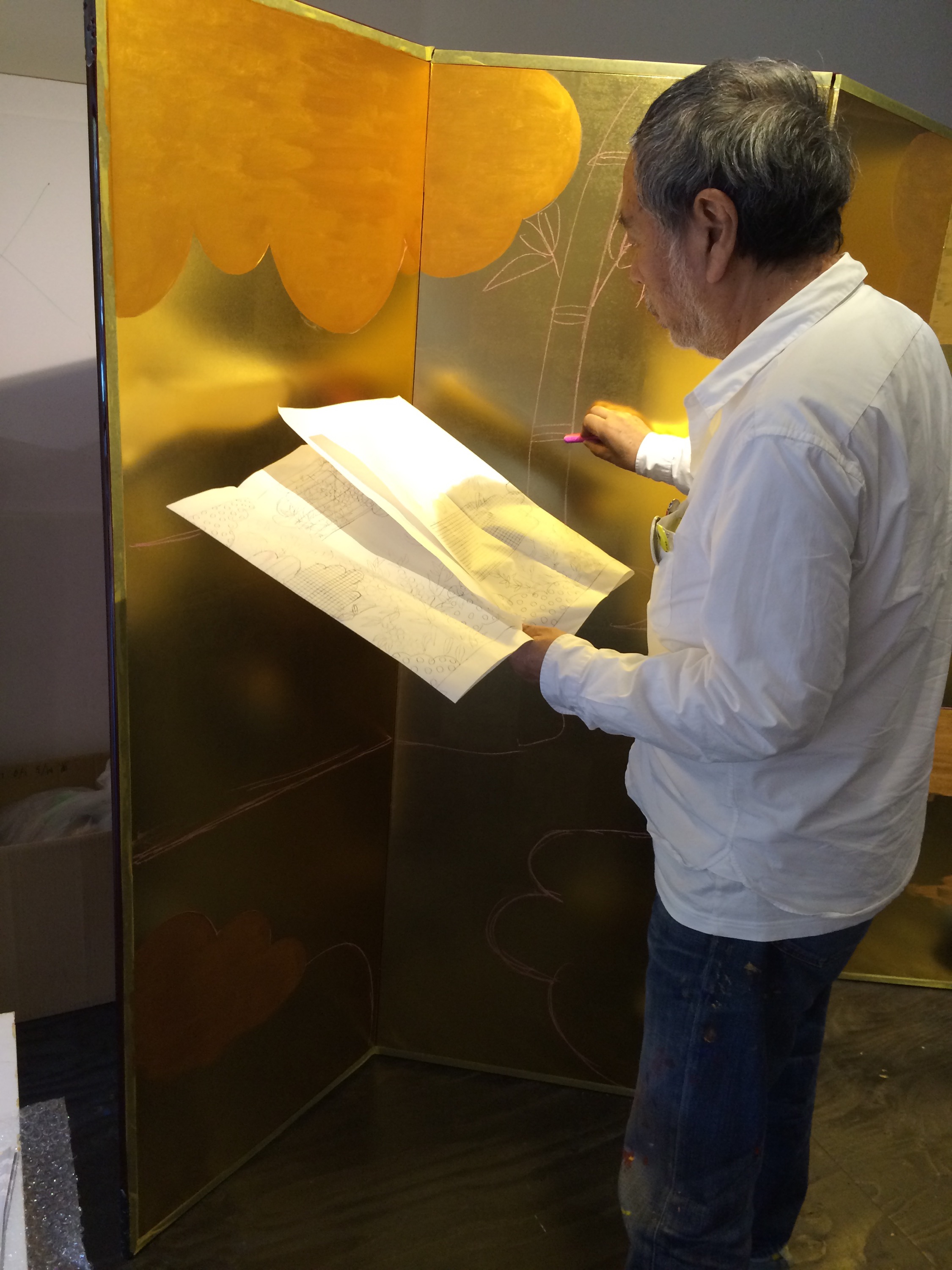 キーヤン ダイアリー〈笑顔の使者の宝探し〉京都高島屋投稿者:TakedaShujiroカテゴリー:Ki-Yan Stuzio2015.01.05『笑顔の使者の宝探し』木村 英輝×脇阪 克二 現代の光琳・宗達を思わせる絵師 木村 英輝氏とテキスタイルデザイナー 脇阪 克二氏のセンスが出会い、生まれたビジュアルを屏風に仕立てたものです。 派手華やかに、お正月ショーウィンドウを飾っています! 1月12日まで飾られますので、まだの方は、是非 御覧下さいませ^ ^ 【Rabbit , Jumping to Fortune】 以下は、作業の様子です。|この記事にコメントする|(1)