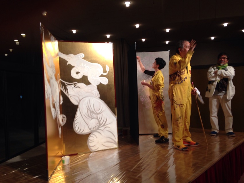 二曲一双の金銀の衝立に、勢いよく、白象、赤象を描きました。