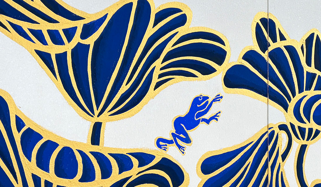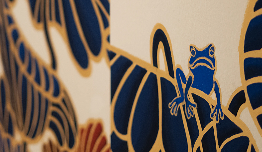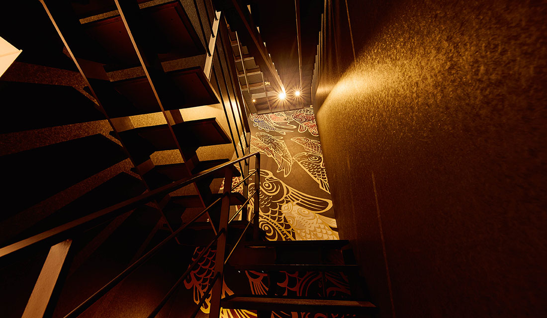 1階から3階にかけて昇る階段室「鯉のぼりの階段」の長さ10メートルの壁面にフルオーダーのクロス。そして、3階和室「Lotus Room」に納められた襖絵「生命讃歌」を制作しました。