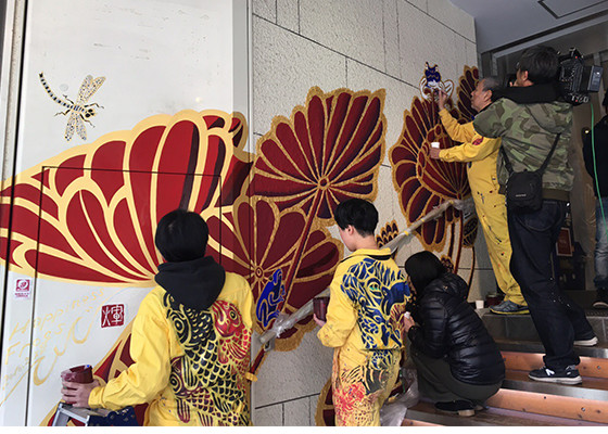 2月中旬。京都の中心街 河原町通り三条にて壁画制作を行いました。 この制作風景を見れなかったという方は、 木村英輝先生や制作風景、Ki-Yan Stuzio店内などが放映されます。ブログを読む 2016年4月1日 19:54 〜 20:00 放送予定 朝日放送 「ココイロ」 【 井筒ホテル 】エントランス |
