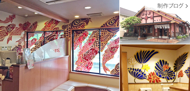 店内入ってすぐの壁面に群れをなす鯉が、お客様を出迎えます。 まるでそこから飛んできたように | ||||
