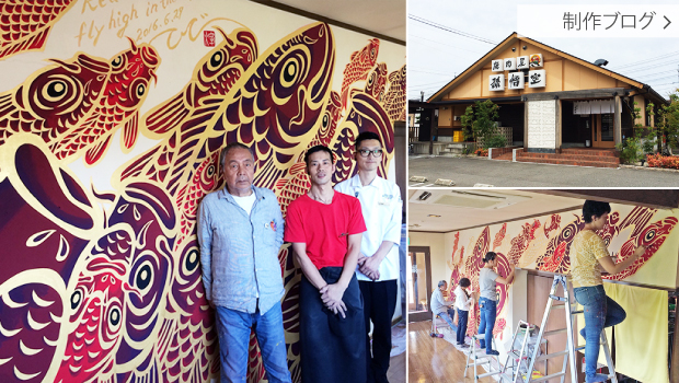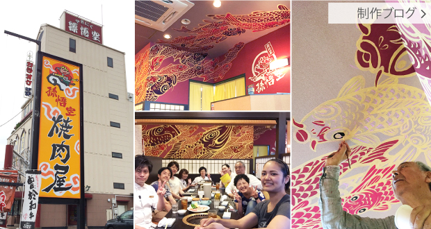 広島県で3店舗を展開している「やきにく孫悟空」様。 タイトルは〈 Red Carp fly high in the sky 〉 3店舗を弾丸ツアーで一気に巡り、描き上げました。 ▼ 東深津店 ▼