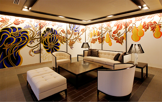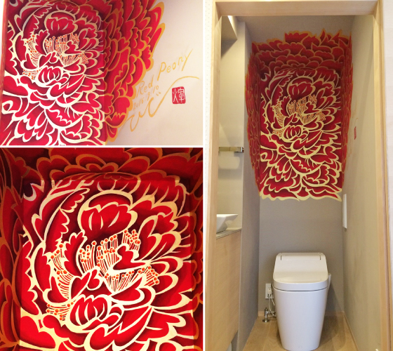 天井から側壁までお部屋いっぱいの大輪の真っ赤な"牡丹"を。