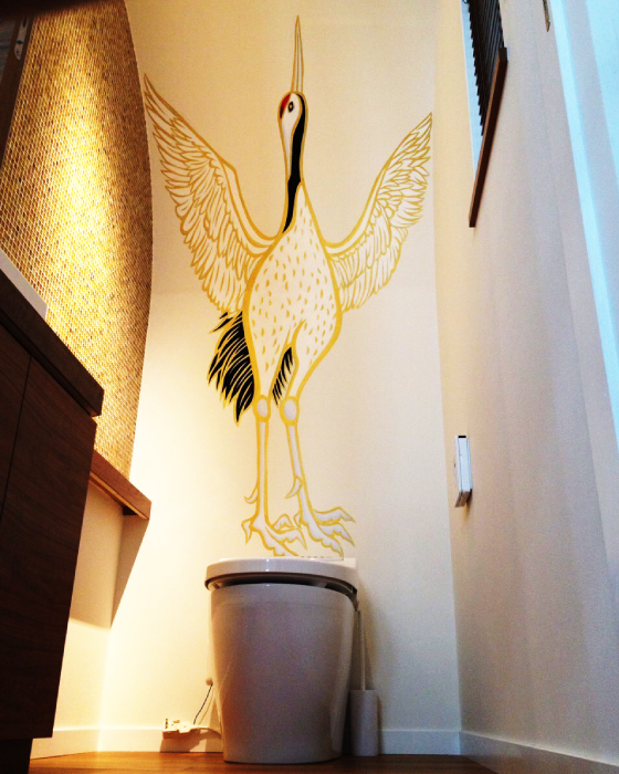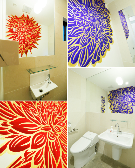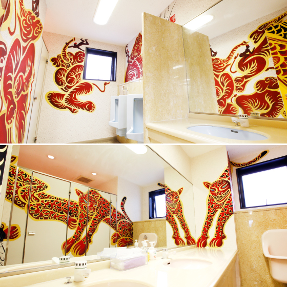 お手洗いには、壁を倍に写す"鏡"と、モチーフをより躍動的にみせる"天井"があるのです。