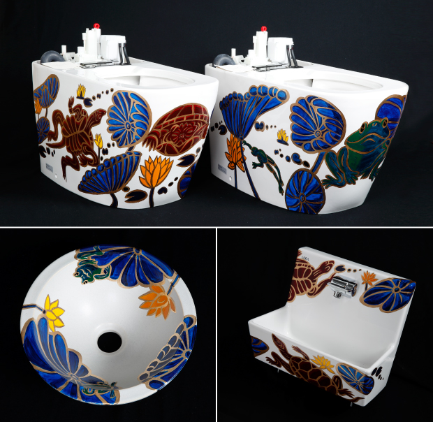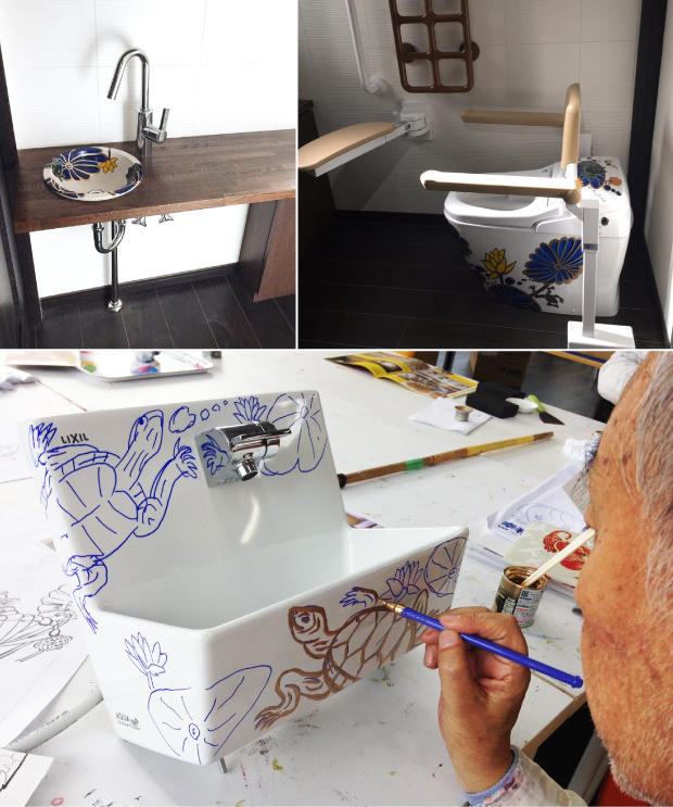 真っ白な磁器にためらうことなく、すらすらと下書きを描きあげます。 水回りの設備のため、毒性がなく耐水性のある