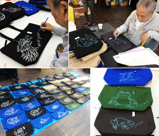 モチーフは先生自ら選ばれ、「酉年」に因んだ"軍鶏"や"フクロウ"、 世界に1つだけの1点もののバッグ。 |