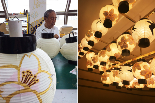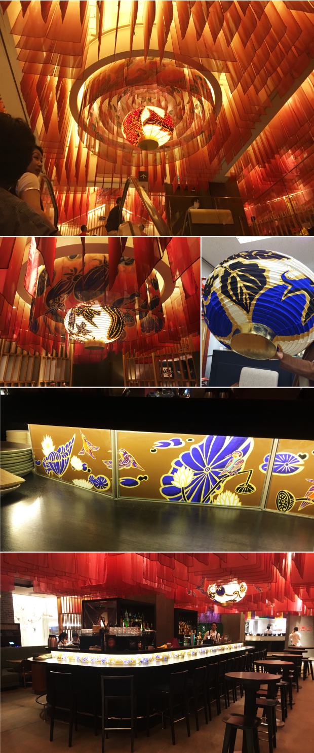 レストランフロア内の天井には全面に、 そして、その中でひと際存在感を放つ特注サイズの巨大提灯は、木村英揮直筆。