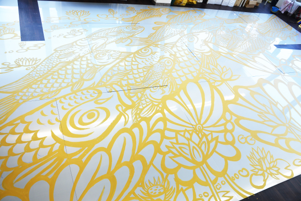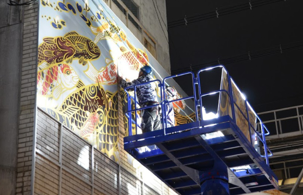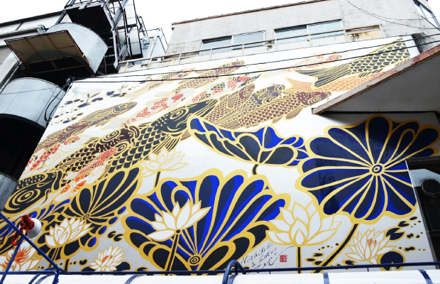 今回の物件は京都錦天満宮の前にある4階建てビルの外壁。 モチーフは蓮の池におよぐ沢山の鯉。